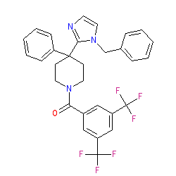 | SMILES | O=C(c1cc(C(F)(F)F)cc(C(F)(F)F)c1)N1CCC(c2ccccc2)(c2nccn2Cc2ccccc2)CC1 |