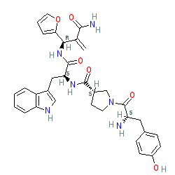 | SMILES | C=C(C(N)=O)[C@@H](NC(=O)[C@H](Cc1c[nH]c2ccccc12)NC(=O)[C@H]1CCN(C(=O)[C@@H](N)Cc2ccc(O)cc2)C1)c1ccco1 |