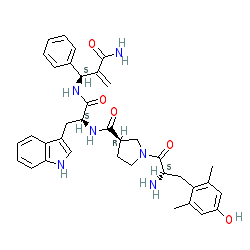 | SMILES | C=C(C(N)=O)[C@@H](NC(=O)[C@H](Cc1c[nH]c2ccccc12)NC(=O)[C@@H]1CCN(C(=O)[C@@H](N)Cc2c(C)cc(O)cc2C)C1)c1ccccc1 |
