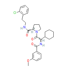 | SMILES | COc1cccc(C(=O)N[C@H](C(=O)N2CCC[C@H]2C(=O)NCCc2ccccc2Cl)C2CCCCC2)c1 |
