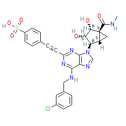 | SMILES | CNC(=O)[C@@]12C[C@@H]1[C@@H](n1cnc3c(NCc4cccc(Cl)c4)nc(C#Cc4ccc(S(=O)(=O)O)cc4)nc31)[C@H](O)[C@@H]2O |