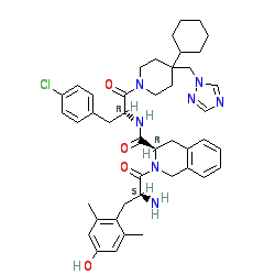 | SMILES | Cc1cc(O)cc(C)c1C[C@H](N)C(=O)N1Cc2ccccc2C[C@@H]1C(=O)N[C@H](Cc1ccc(Cl)cc1)C(=O)N1CCC(Cn2cncn2)(C2CCCCC2)CC1 |