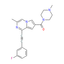 | SMILES | Cc1cn2cc(C(=O)N3CCN(C)CC3)cc2c(C#Cc2cccc(F)c2)n1 |